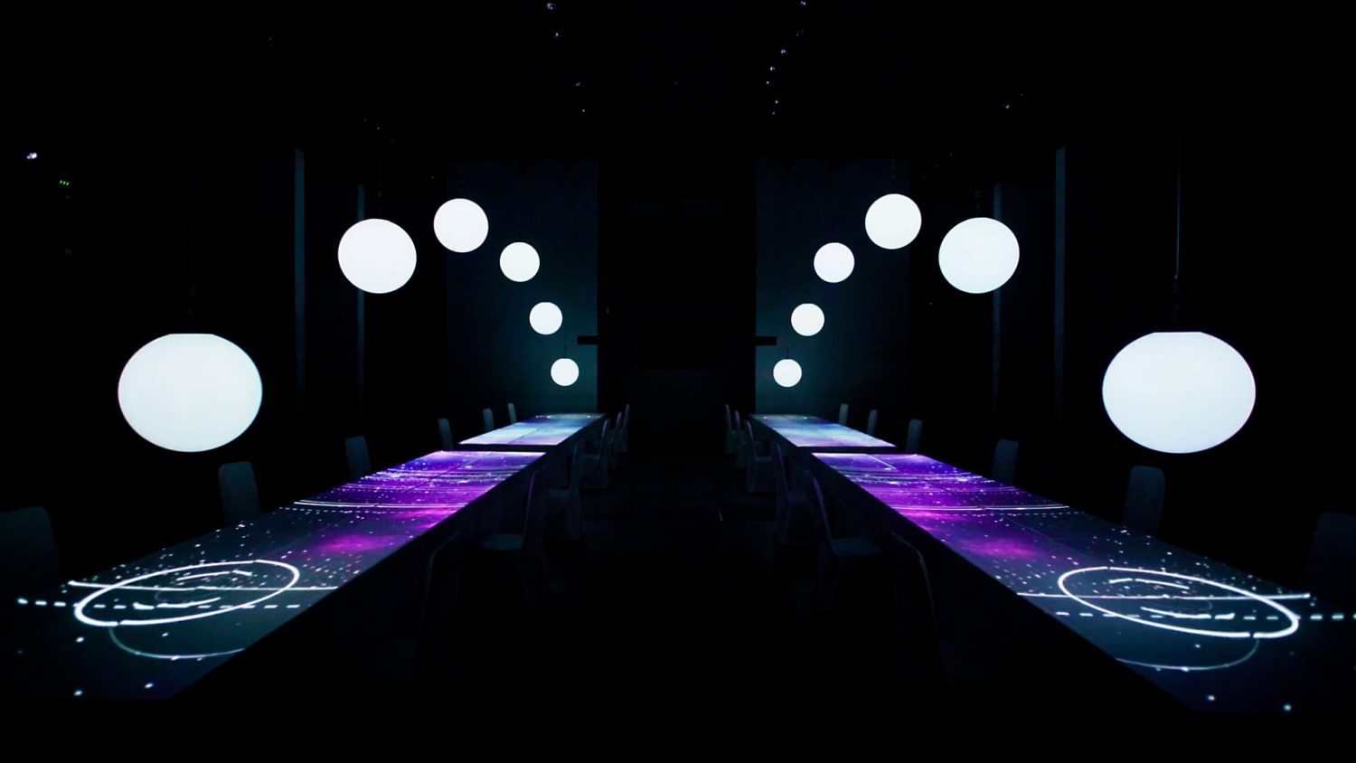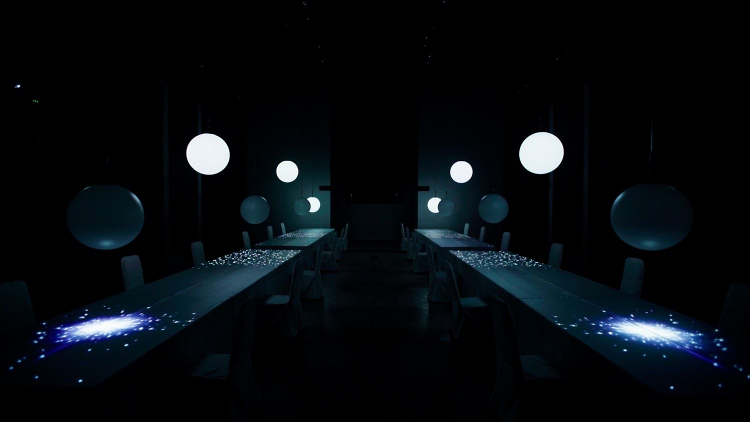 投射と反射の技術を組み合わせ、光り輝く球体とともに、ミラー毎の絵柄が変わる映像インスタレーションを実現。
