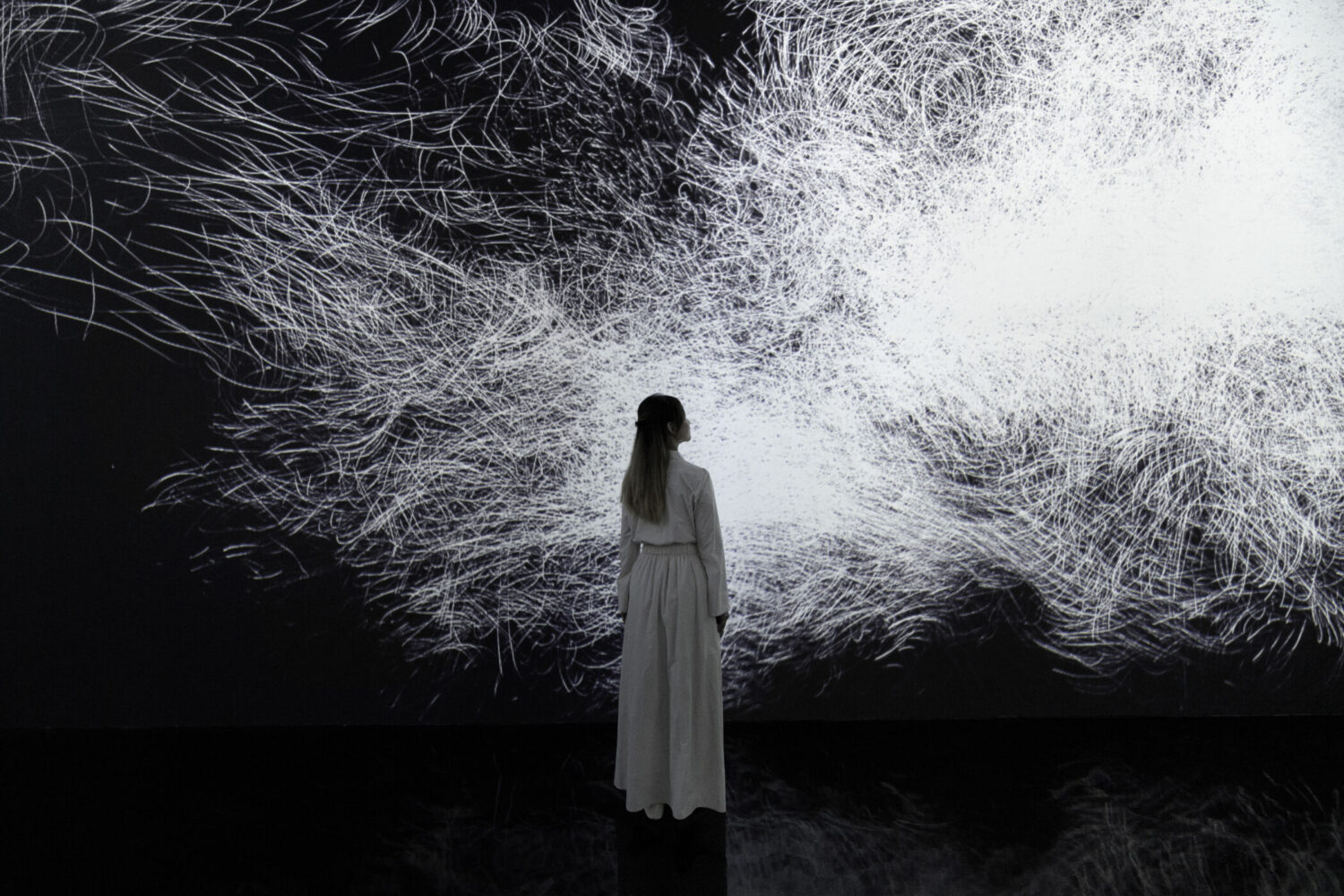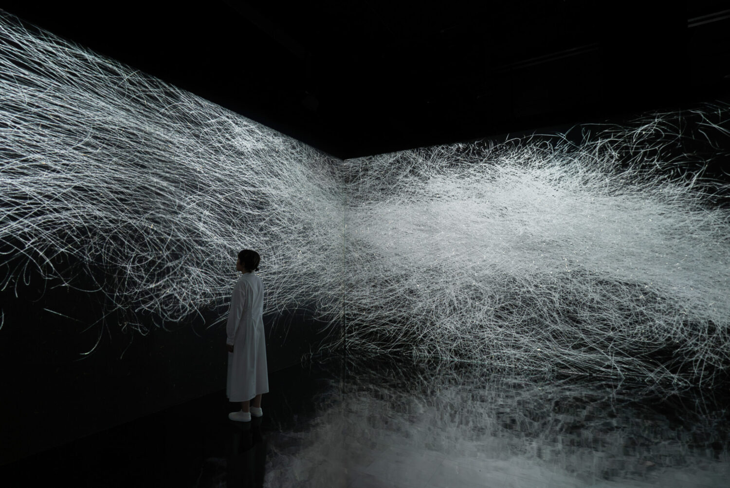 無数の光の塊が空中に浮遊する。1つ1つの光の塊は、2色で構成され、色の境界が固体のように明確に分かれている。